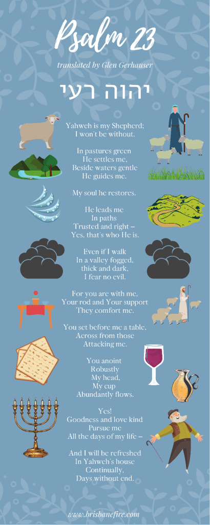Morning Thought: “Yahweh is my shepherd; I won’t go without” (Psalm 23:1, my translation). I recently translated Psalm 23 to help ground me in the Shepherd’s care. It was for myself and I didn’t think I’d share it. But then the Holy Spirit moved me to make it into an infographic and I sensed it could help others. It’s meant to sound a little different, causing you to slow down and think afresh about this classic Psalm. Also, my goal was to translate it in a poetic way. Check it out below. Please touch to open and press to save to your device.