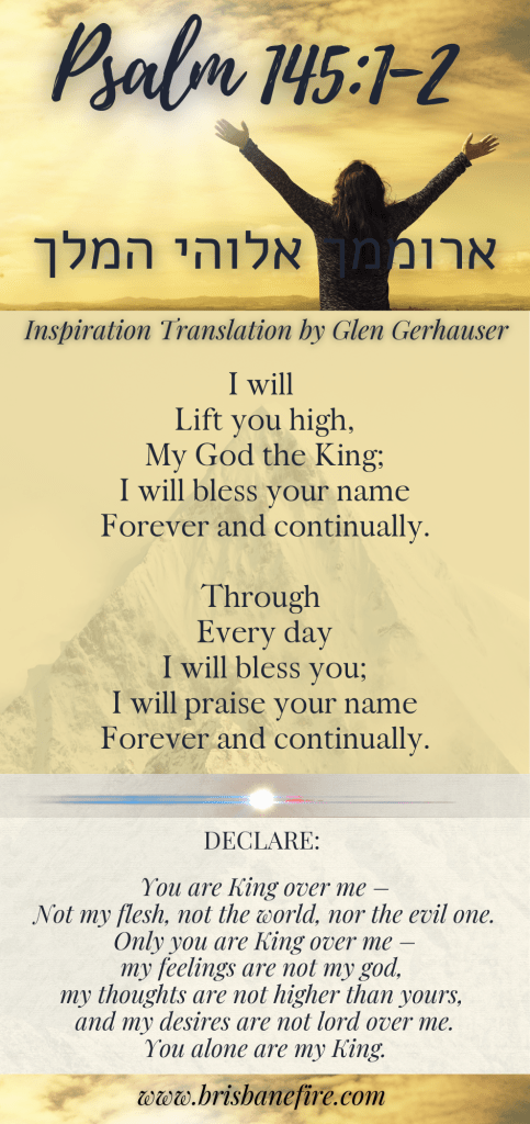 Morning Thought: “I will lift you high, my God the King; I will bless your name forever and continually” (Ps. 145:1, IT). Declare over yourself today: ‘You are King over me – not my flesh, not the world, nor the evil one. Only you are King over me – my feelings are not my god, my thoughts are not higher than yours, and my desires are not lord over me. You alone are my King.’ Check out the latest infographic based on Psalm 145. Tap to open and press to save.