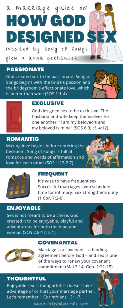 Morning Thought: God didn’t create sexual intimacy within marriage to be boring, routine and lacklustre. Song of Songs paints a more vibrant picture. God has designed the marriage relationship to be passionate, exclusive, romantic, fun, enjoyable, covenantal and thoughtful. For more, check out one of our latest infographics: A Marriage Guide to How God Designed Sex. (Tap to open and press to save.)