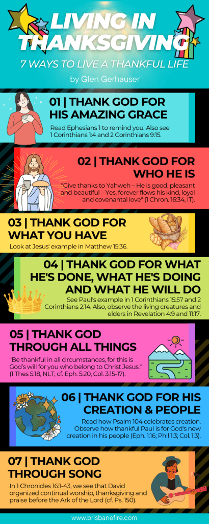Morning Thought: Thanksgiving restores your soul. Live in thanksgiving by practicing these seven ways of giving thanks. You can focus on one each day of the week. Check out our latest infographic: Living in Thanksgiving (tap to open and press to save). Lastly, tonight’s our last open night at Holy Fire School (Level 7/117 Queen St. Mall, Brisbane). Registration will close this Thursday (23 FEB): http://www.holyfireschool.com